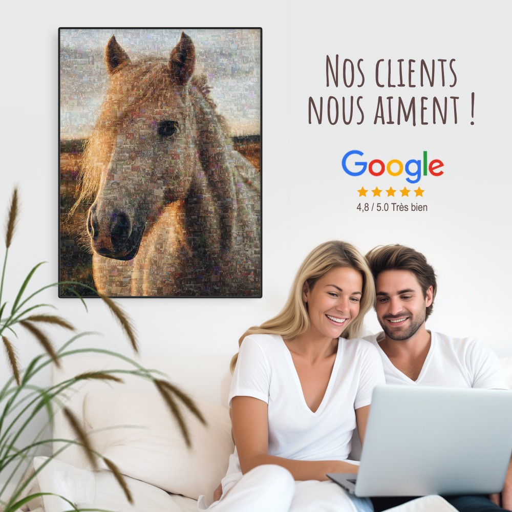 Une mosaïque photo photo de ton cheval est la façon parfaite de préserver les plus beaux moments avec ton fidèle compagnon dans une œuvre d'art impressionnante. Il réunit des instants spéciaux – des sorties à cheval, des compétitions, des séances d'entraînement, jusqu'à des clichés du quotidien. Une combinaison de portraits, de photos en mouvement et d'images affectueuses rend le mosaïque vivant et unique.