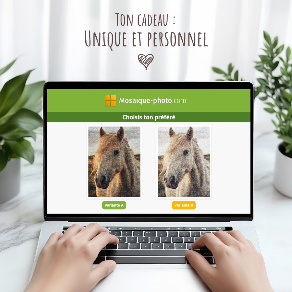 Pour une mosaïque photo photo réussi, tu devrais sélectionner au moins 50 photos. Avec jusqu'à 1.000 photos, tu peux parfaitement représenter la diversité des souvenirs avec ton cheval. Ce cadeau photo de haute qualité sera imprimé sur toile ou verre et constitue une décoration spéciale pour ton intérieur ou un cadeau idéal pour les amoureux des chevaux.