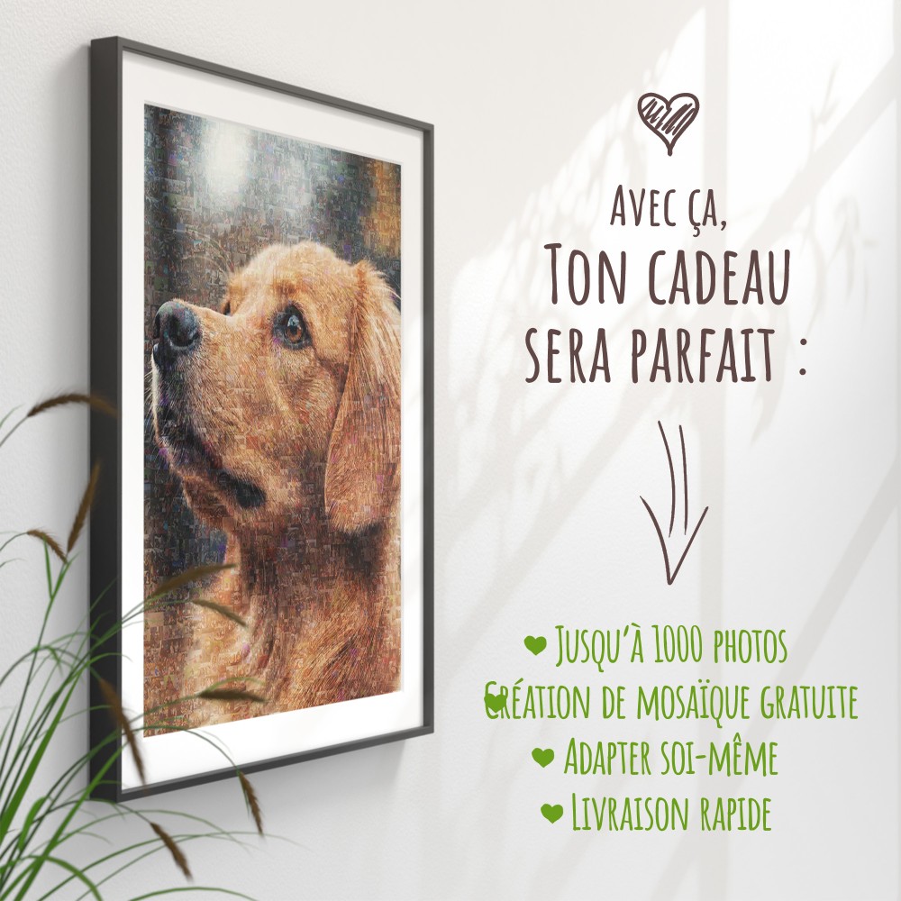 Pour une mosaïque photo photo impressionnant, tu devrais sélectionner au moins 50 photos. Avec jusqu'à 1.000 photos, tu peux parfaitement représenter la diversité des souvenirs avec ton chien. Ce cadeau photo de haute qualité sera imprimé sur toile ou verre et constitue un souvenir spécial qui embellira ton intérieur ou sera le cadeau parfait pour les amoureux des chiens.