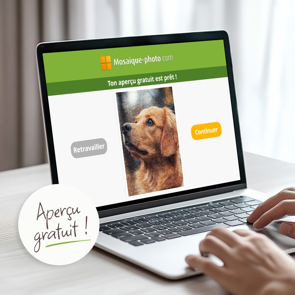 La création de votre mosaïque photo est entièrement gratuite – c’est notre cadeau pour vous ! Vous recevez un aperçu gratuit de votre mosaïque afin de vous assurer que votre œuvre d’art correspond parfaitement à vos attentes.